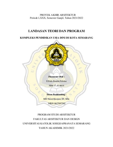 FEBRINA, ELFRIDA KUNTHI (2022) KOMPLEKS PENDIDIKAN USIA DINI DI KOTA SEMARANG. S1 thesis, UNIVERSITAS KATOLIK SOEGIJAPRANATA.