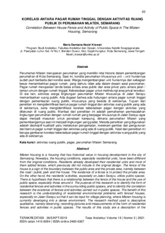 Kiswari, Maria Damiana Nestri KORELASI ANTARA PAGAR RUMAH TINGGAL DENGAN AKTIVITAS RUANG PUBLIK DI PERUMAHAN MLATEN, SEMARANG Correlation Between House Fence and Activity of Public Space in The Mlaten Housing, Semarang. TESA Arsitektur. ISSN 1410-6094
