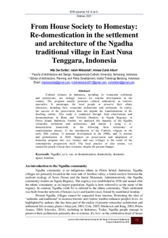 Estika, Nita Dwi From House Society to Homestay: Re-domestication in the settlement and architecture of the Ngadha traditional village in East Nusa Tenggara, Indonesia. ISVS e-journal: The Journal of the International Society for the Study of Vernacular Settlement.