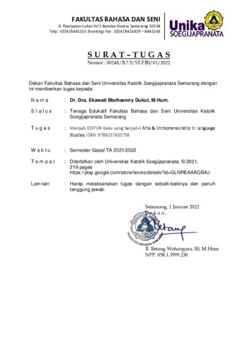UNSPECIFIED (2021) Arts & Entrepreneurship in Language Studies. In: Dukut, Ekawati Marhaenny, (ed.) Arts & Entrepreneurship in Language Studies. Universitas Katolik Soegijapranata. ISBN 978-623-7635-75-8