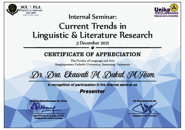 Dukut, Ekawati Marhaenny (2021) Green Studies: Ecocriticism for Literature Research. In: Internal Seminar: Current Trends in Linguistic & Literature Research, 3 Desember 2021, Faculty of Language and Arts Soegijapranata Catholic University. (Unpublished)