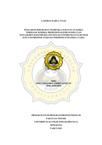 ANDRIYANTO, NOVI ANGGORO (2022) PENGARUH PERUBAHAN NOMENKLATUR SATUAN KERJA TERHADAP KINERJA PROFESIONALISME KONSULTAN MANAJEMEN KONSTRUKSI (STUDI KASUS PEMBANGUNAN RUMAH SUSUN DI PROPINSI ACEH DAN PROPINSI SUMATERA UTARA). Project Report. Program Studi Teknik Sipil Unika Soegijapranata Semarang. (Unpublished)