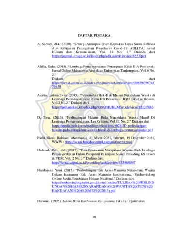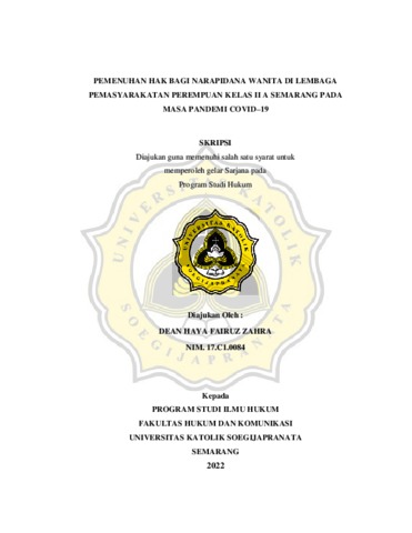 ZAHRA, DEAN HAYA FAIRUZ (2022) PEMENUHAN HAK BAGI NARAPIDANA WANITA DI LEMBAGA PEMASYARAKATAN PEREMPUAN KELAS II A SEMARANG PADA MASA PANDEMI COVID–19. S1 thesis, Universitas Katholik Soegijapranata Semarang.