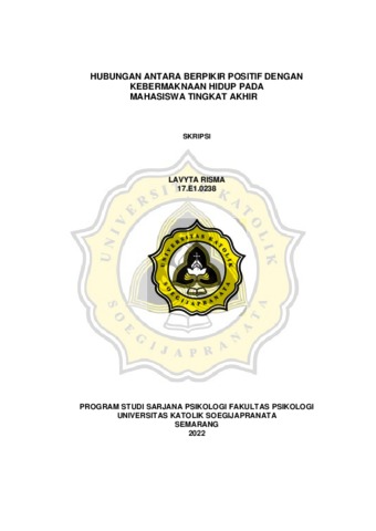 RISMA, LAVYTA (2022) HUBUNGAN ANTARA BERPIKIR POSITIF DENGAN KEBERMAKNAAN HIDUP PADA MAHASISWA TINGKAT AKHIR. S1 thesis, Universitas Katholik Soegijapranata Semarang.