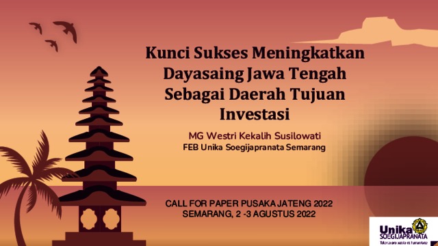 SUSILOWATI, MG. WESTRI KEKALIH (2022) Faktor Kunci Sukses Meningkatkan Dayasaing Jawa Tengah Sebagai Daerah Tujuan Investasi. In: Call for Paper “Menuju Jawa Tengah Sejahtera dan Berdikari”, 2 - 3 Agustus 2022, Semarang.
