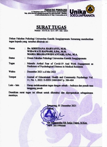 Haryanti, Kristiana (2022) FEAR OF COVID-19 AND WORK ENGAGEMENT AS PREDICTORS OF PSYCHOLOGICAL DISTRESS IN MEDICAL RESIDENTS. Journal of Educational, Health and Community Psychology, 11 (1). pp. 384-404. ISSN 2460-8467