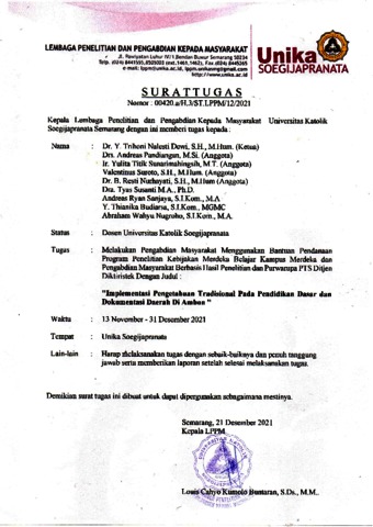 Dewi, Yustina Trihoni Nalesti and Pandiangan, Andreas and Sunarimahingsih, Yulita Titik and Suroto, Valentinus and NURHAYATI, BERNADETA RESTI and Susanti, B. Tyas and Sanjaya, Andreas Ryan and Budiarsa, Thian and Nugroho, Abraham Wahyu IMPLEMENTASI PENGETAHUAN TRADISIONAL PADA PENDIDIKAN DASAR DAN DOKUMENTASI DAERAH DI AMBON. UNIKA SOEGIJAPRANATA.