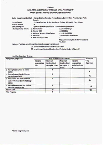 Hutabarat, Yohana Sondang Activa and Widyorini, Endang and RAHAYU, ESTHI (Peer Review) Harga Diri, Konformitas Teman Sebaya, dan Perilaku Perundungan pada Remaja. Universitas Katolik Soegijapranata. (Unpublished)