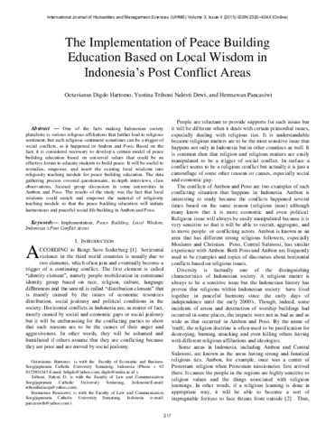 HARTOMO, OCTAVIANUS DIGDO and Dewi, Yustina Trihoni Nalesti and Pancasiwi, Heribertus Hermawan The Implementation of Peace Building Education Based on Local Wisdom in Indonesia’s Post Conflict Areas. International Journal of Humanities and Management Sciences. ISSN 2320–4044