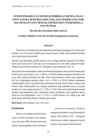 SISWANTO, - and Setiawan, Florentinus Budi (2017) Turnitin STUDI PENDAHULUAN MENGUJI PERBEDAAN KETEGANGAN OTOT ANTARA JENIS KELAMIN, USIA, DAN SUBJEK YANG NOR�MAL DENGAN YANG MENGALAMI KELUHAN NYERI KEPALA DAN PUNDAK. Unika.