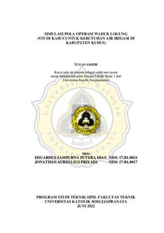 PRIYADI, JONATHAN AURELLIUS and DIAS, EDUARDUS SAMPURNA PUTERA (2022) SIMULASI POLA OPERASI WADUK LOGUNG (STUDI KASUS UNTUK KEBUTUHAN AIR IRIGASI DI KABUPATEN KUDUS). Other thesis, Universitas Katholik Soegijapranata Semarang.