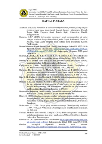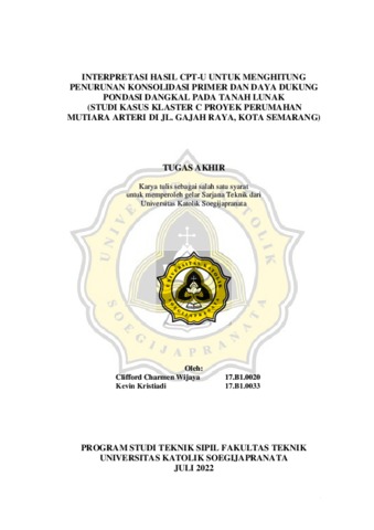 Wijaya, Clifford Charmen and Kristiadi, Kevin (2022) INTERPRETASI HASIL CPT-U UNTUK MENGHITUNG PENURUNAN KONSOLIDASI PRIMER DAN DAYA DUKUNG PONDASI DANGKAL PADA TANAH LUNAK (STUDI KASUS KLASTER C PROYEK PERUMAHAN MUTIARA ARTERI DI JL. GAJAH RAYA, KOTA SEMARANG). Other thesis, Universitas Katholik Soegijapranata Semarang.
