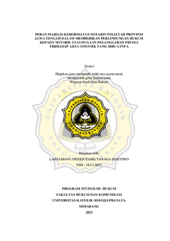 HARTONO, LAKSAMANA VIGGOUTAMA TANAGA (2022) PERAN MAJELIS KEHORMATAN NOTARIS WILIAYAH PROVINSI JAWA TENGAH DALAM MEMBERIKAN PERLINDUNGAN HUKUM KEPADA NOTARIS ATAS DUGAAN PELANGGARAN PIDANA TERHADAP AKTA OTENTIK YANG DIBUATNYA. S1 thesis, Universitas Katholik Soegijapranata Semarang.