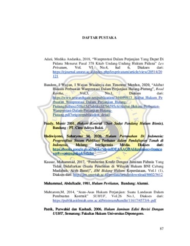 Dalam perjanjian utang-piutang terdapat objek jaminan yang diserahkan Debitur kepada Kreditur. Objek jaminan yang diserahkan kepada Kreditur tidak memiliki akta jaminan fidusia, hanya berdasarkan perjanjian kontrak baku saja yaitu perjanjian utang-piutang. Apabila Debitur tidak melaksanakan prestasinya sesuai dengan ketentuan yang tercantum dalam perjanjian utang-piutang, apakah Kreditur memiliki wewenang melakukan penyitaan untuk menjual objek jaminan guna pelunasan utang-piutang yang ada karena pada dasarnya pihak Koperasi selaku Kreditur tidak memiliki sertifikat fidusia untuk melakukan penyitaan namun apabila menggunakan pedoman berdasarkan perjanjian utang-piutang apakah secara hukum legal karena berdasarkan klausula perjanjian utang-piutang di Koperasi CU Mitra Lestari tidak diatur secara khusus terkait dengan penyitaan objek jaminan. Oleh karena itu, diperlukan kajian mengenai legitimasi penyitaan objek jaminan fidusia dalam perjanjian utang-piutang di bawah. Tujuan penelitian ini adalah untuk mengetahui bentuk perjanjian yang ada di Koperasi CU Mitra Lestari Batang; mengetahui legitimasi Kreditur dalam penyitaan objek jaminan dalam perjanjian utang-piutang di bawah tangan; dan mengetahui pelindungan hukum terhadap Debitur atas penyitaan objek jaminan. Penelitian ini dilakukan menggunakan metode kualitatif, yakni akan mengumpulkan data yang berkaitan dengan suatu penemuan mengenai sahnya penyitaan objek jaminan fidusia dalam perjanjian utang-piutang di bawah tangan di Koperasi CU Mitra Lestari Batang. Penulis melakukan analisa legitimasi penyitaan objek jaminan fidusia dalam perjanjian utang-piutang didukung oleh wawancara dengan narasumber dan dokumen kepustakaan Koperasi CU Mitra Lestari. Spesifikasi penelitian bersifat deskriptif analistis sedangkan pengumpulan data dilakukan dengan penelitian lapangan dan penelitian kepustakaan. Metode analisa data yang digunakan ialah metode kualitatif. Hasil penelitian menunjukkan bahwa penyitaan objek jaminan fidusia dalam perjanjian utang-piutang masuk kedalam kategori legitimate secara perjanjian pokok dan perjanjian accesoir karena mengacu pada perjanjian yang telah disepakati oleh para pihak. Sesuai dengan prinsip hukum Pasal 1338 Ayat (1) Kitab Undang-Undang Hukum Perdata yaitu perjanjian tersebut berlaku sebagai undang-undang bagi para pihak yang terikat dalam perjanjian atau yang dikenal dengan istilah Pacta Sunt Servanda