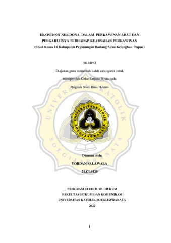 SALAWALA, YORDAN (2022) EKSISTENSI NER DONA DALAM PERKAWINAN ADAT DAN PENGARUHNYA TERHADAP KEABSAHAN PERKAWINAN (Studi Kasus Di Kabupaten Pegunungan Bintang Suku Ketengban Papua). S1 thesis, Universitas Katholik Soegijapranata Semarang.