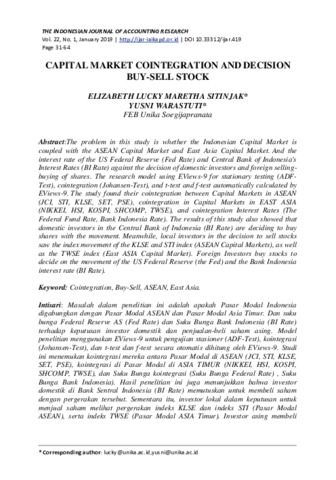 Sitinjak, Elizabeth Lucky Maretha and Warastuti, Yusni (2019) CAPITAL MARKET COINTEGRATION AND DECISION BUY-SELL STOCK. THE INDONESIAN JOURNAL OF ACCOUNTING RESEARCH, 22 (1). pp. 31-64. ISSN 2655-1748