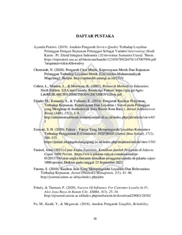Adanya penelitian ini dikarenakan adanya masalah yang timbul di Toko Noyorono yang berlokasi di Desa Kayen, Kabupaten Pati, Jawa Tengah dimana terjadi penurunan penjualan sepeda di bagian sparepart dan sepeda ketika trend sepeda sedang meningkat. Dikarenakan sparepart yang memberikan margin laba lebih tinggi maka sparepart diteliti. Sebelum melakukan penelitian, peneliti telah melakukan pra survey untuk mengetahui hal apa yang diduga menjadi pengaruh loyalitas konsumen di Toko Noyorono. Didapatkan hasil bahwa diduga yang menjadi pengaruh konsumen loyal adalah kualitas layanan. Penelitian ini bertujuan untuk mengetahui hubungan antara kualitas layanan (dalam dimensi variabel tangible (X1), reliability (X2), responsiveness (X3), assurance (X4), dan empathy (X5) baik secara parsial maupun simultan terhadap loyalitas konsumen (Y). Sampel yang digunakan dalam penelitian ini sebanyak 30 responden dengan menggunakan teknik sampling purposive sampling dengan konsumen kriteria khusus yaitu responden yang telah melakukan pembelian minimal 2x dan melakukan pembelian sparepart sepeda. Hasil yang didapat adalah variabel responsiveness dan assurance berpengaruh secara positif dan signifikan terhadap loyalitas konsumen Toko Noyorono sedangkan variabel tangible, reliability, dan empathy berpengaruh secara positif tetapi tidak signifikan terhadap loyalitas konsumen.