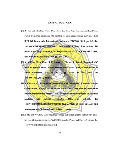 Semakin berkembangnya jaman banyak menggunakan energy terbarukan salah satu contohnya adalah Photovoltaic (PV) sebagai sarana yang digunakan untuk mengkonversikan energi Untuk mendapatkan suatu keluaran daya maksimal diperluka DC-DC converter dengan menggunakan algoritma Maximum Power Point Tracker (MPPT). Sistem yang ada untuk Indonesia sekarang ini adalah 3 fasa 4 kawat (3F4K), sehingga sistem tersebut harus terintegrasi menjadi satu. Masalah yang muncul inverter tiga fasa empat kawat di atur dengan sistim open loop yang dimana dengan sistim ini inverter memiliki kelemahan yaitu tidak dapat mengatur tegangan dan arus sesuai dengan yang diinginkan. Sehingga dilakukan sebuah penelitian dengan menggunakan strategi kontrol PI (Proportional Integrator) dengan dua kendali yaitu tegangan dan arus pada inveter 3F4K akan tetapi hasil bentuk gelombang keluaran yang dihasilkan mengalami ketidakstabilan ketika melewati perbatasan titik nol sehingga tidak membentuk gelombang sinusoidal yang baik. Untuk mengatasi hal tersebut telah dilakukan penelitian inverter 3F4K menggunakan strategi kontrol PI (Proportional Integrator) sebagai pengontrol tegangan dan kontrol P (proportional) sebagai pengendali arus, kontrol kendali dan switching dengan menggunakan mikrokontroller STM32F407. Telah dilakukan validasi menggunakan Power simulator dan implementasi hardware.