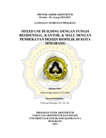 LIANTO, RAFAEL ADRIAN (2022) MIXED USE BUILDING DENGAN FUNGSI RESIDENSIAL, KANTOR, & MALL DENGAN PENDEKATAN DESAIN BIOFILIK DI KOTA SEMARANG. S1 thesis, Unika Soegijapranata Semarang.