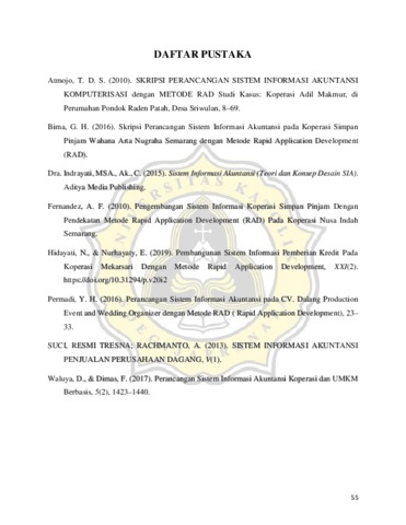 Penelitan ini merancang system akuntansi Pendekatan Rapid Application Development (RAD) pada Koperasi Rodeo Semarang yang berbasis android. Alasan dipilihnya Koperasi Rodeo Semarang karena Sistem yang masih digunakan dalam koperasi ini masih manual dan pencatatan yang dilakukan masih belum tepat waktu dan hanya untuk sambilan saja. Para pengurus koperasi tidak terlalu paham mengenai akuntansi, hal ini yang menyebabkan banyak laporan tertunda dan sering terjadi perbedaan antara penulisan dengan stok yang ada. Pencatatan laporan keuangan dalam koperasi hanya menggunakan tulisan tangan dan sekretaris mendata juga hanya dibantu dengan sistem Ms. Excel. Dengan tidak adanya -sistem informasi akuntasi sering terjadi kehilangan barang dalam koperasi dan data yang ada tidak sesuai. Dalam penelitian ini peneliti menggunakan metode pengembangan sistem informasi akuntansi yang berbasis Rapid Application Development (RAD). Peneliti menggunakan metode tersebut dengan tujuan untuk memberikan pengembangan dalam sistem informasi akuntansi Koperasi Rodeo Semarang secara cepat dan tepat agar dapat mempermudah dalam menginput infomasi yang ada dengan mudah dan sesuai dengan kebutuhan koperasi tersebut. System ini dibuat seusai dengan kebutuhan dari koperasi dan hasil dari pembuatan system ini berguna dalam menyelesaikan masalah kesulitan pada pencatatan transaksi yang ada.