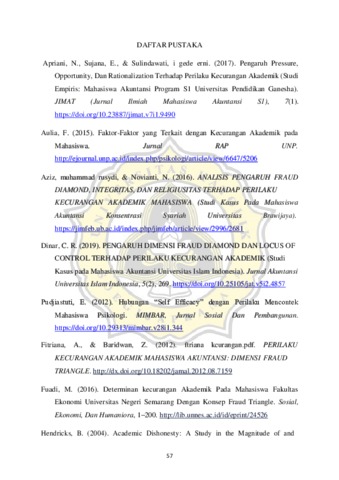 Penelitian ini bertujuan untuk mengetahui pengaruh fraud triangle, religiusitas, self- efficacy, dan Locus of control terhadap perilaku kecurangan akademik. Penelitian ini merupakan penelitian kausal komparatif dengan menggunakan data primer yang dikumpulkan melalui kuesioner. Populasi penelitian meliputi mahasiswa S1 Universitas Soegijapranata Semarang angkatan 2017, 2018, 2019, dan 2020. Sampel penelitian adalah 98 mahasiswa yang diperoleh dengan teknik purposive sampling. Teknik analisis data yang digunakan yaitu dengan menggunakan Statistical Product and Service Solutions (SPSS). Hasil penelitian ini menunjukkan bahwa tekanan, kesempatan, dan rasionalisasi berpengaruh positif terhadap perilaku kecurangan akademik sedangkan religiusitas, self-efficacy berpengaruh negatif, dan Locus of control external lebih berpengaruh terhadap perilaku kecurangan akademik. Dengan demikian, perilaku kecurangan akademik diharapkan dapat dikurangi dengan meningkatkan religiusitas dan self-efficacy mahasiswa serta mengurangi adanya tekanan, kesempatan, dan rasionalisasi terhadap kecurangan akademik. Bentuk-bentuk kecurangan akademik berkembang seiring dengan fenomena yang terjadi, seperti pada masa ini dimana sedang terjadi wabah covid-19 yang menuntut perubahan beberapa sistem kuliah menjadi kuliah dan ujian online. Minimnya pengawasan menimbulkan sebuah kesempatan bagi mahasiswa untuk menyontek lantaran tidak memahami materi dengan baik. Mereka berpikir yang terpenting adalah hasil yang didapatkan dibanding dengan proses mendapatkannya. Meskipun telah diperingatkan oleh para pengawas ujian dan dengan adanya peraturan yang dibuat, tetapi tetap saja mereka melakukan kecurangan. Pembelajaran jarak jauh yang menjadi sebuah peluang membuat mahasiswa lebih berani untuk melakukan kecurangan akademik dengan berbagai bentuk seperti melakukan kerjasama melalui grup chat atau membuka internet saat ujian berlangsung.
