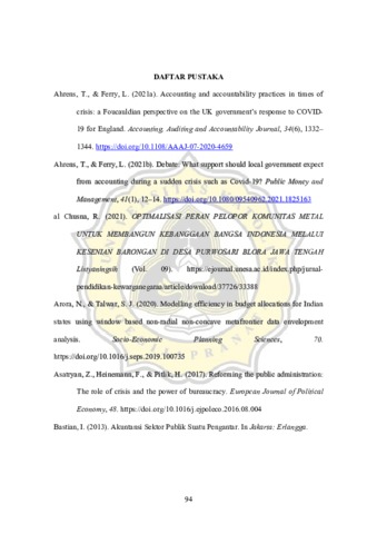 Penelitian ini bertujuan untuk mengetahui bagaimana pelaksanaan refocusing dan realokasi Anggaran Pendapatan dan Belanja Daerah Tahun Anggaran di masa pandemi COVID-19 di Kabupaten Semarang, serta bagaimana jaringan yang terbentuk dialam proses penganggaran dan perubahan yang terjadi dengan menggunakan tinjauan Actor Network Theory guna mengidentifikasi aktor yang berperan dalam jaringan yang terbentuk. Penelitian ini menggunakan metode kualitatif deskriptif dengan pendekatan induktif, serta menggunakan teknik observasi, wawancara dan dokumentasi. Hasil penelitian menunjukkan bahwa proses pelaksanaan refocusing dan realokasi yang termasuk dalam proses perubahan APBD di Kabupaten Semarang membentuk sebuah jaringan yang didalam jaringan tersebut terdapat berbagai macam aktor yang terlibat mulai dari aktor manusia maupun non manusia. Aktor manusia dapat berupa para pejabat pemerintahan yang berwenang dan untuk aktor non manusia berupa sistem guna mempermudah jalannya proses penganggaran terutama di masa COVID-19 dan juga terdapat peraturan yang mendasari proses penganggaran APBD.