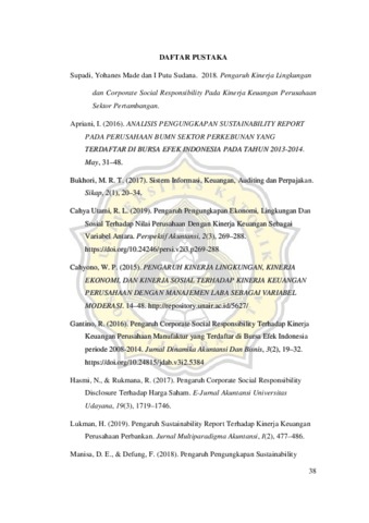 Penelitian ini bertujuan (1) mencari pengaruh kinerja sosial terhadap kinerja keuangan perusahaan, (2) mencari pengaruh kinerja ekonomi terhadap kinerja keuangan perusahaan, dan (3) mencari pengaruh kinerja lingkungan terhadap kinerja keuangan perusahaan. Data dalam penelitian ini merupakan data sekunder yang berupa laporan keberlanjutan (Sustainability Report). Sampel penelitian adalah perusahaan sektor manufaktur, sub sektor industri dasar dan kimia yang terdaftar di Bursa Efek Indonesia (BEI) pada periode 2018-2020. Jumlah sampel pada penelitian ini adalah 37 perusahaan. Variabel dependen yang digunakan adalah kinerja keuangan dengan pengolahan data analisis regresi berganda menggunakan SPSS 22. Hasil penelitian menunjukan bahwa kinerja sosial berpengaruh negatif terhadap kinerja keuangan perusahaan. Kinerja ekonomi berpengaruh negatif terhadap kinerja keuangan perusahaan. Kinerja lingkungan berpengaruh negatif terhadap kinerja keuangan perusahaan