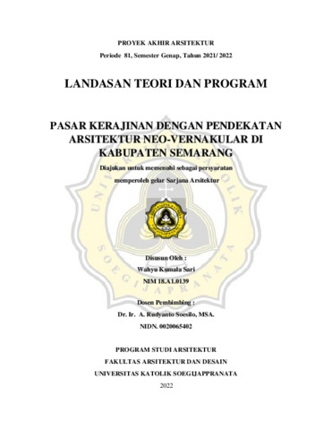 AMI, VELICHA ELENAGARETHA (2022) PASAR KERAJINAN DENGAN PENDEKATAN ARSITEKTUR NEO-VERNAKULAR DI KABUPATEN SEMARANG. S1 thesis, UNIVERSITAS KATOLIK SOEGIJAPRANATA.