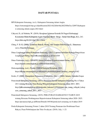 ABSTRAK. Pasar merupakan tempat bertemunya produsen atau penjual dengan konsumen atau beli untuk melakukan aktifitas jual beli. Jenis pasar kini cukup beragam, bergantung dengan jenis barang yang diperjual belikan pada pasar tersebut. Pasar kerajinan merupakan pasar yang secara khusus memperjual belikan barang kerajinan. Projek Akhir Arsitektur dengan judul “Pasar Kerajinan dengan Pendekatan Arsitektur Neo Vernakular di Kabupaten Semarang” dilatar belakangi oleh kurangnya eksistensi dari barang kerajinan yang di produksi di Kabupaten Semarang karena tidak adanya tempat yang secara khusus mewadahi penjualan barang kerajinan tersebut. Kerajinan dari Kabupaten Semarang merupakan salah satu potensi dari bidang kreatif yang sangat potensial untuk dikembangkan karena dapat meningkatkan aspek ekonomi bagi masyarakat serta aspek wisata untuk daerah Kabupaten Semarang. Dimana bangunan tersebut akan mewadahi seluruh aktifitas penjualan kerajinan dengan mempertimbangkan aspek yang menunjang fungsi bangunan sebagai pasar kerajinan yang sekaligus mendukung rencana pembangunan pemerintah untuk mengembangkan sentra pengembangan produk lokal. Selain itu perencanaan bangunan akan menggunakan pendekatan arsitektur Neo- Vernakular untuk dapat mengadaptasi bentuk kelokalan bangunan setempat namun tetap dikembangkan menjadi bentuk yang lebih modern. Pasar kerajinan merupakan tempat bagi penjual dan pembeli untuk melakukan transaksi jual beli barang kerajinan. Begitupula dengan bangunan pasar kerajinan yang direncanakan akan secara khusus memperjual belikan barang kerajinan yang ada di Kabupaten Semarang. Selain digunakan sebagai tempat perdagangan, pada bangunan pasar kerajinan ini akan memuat kegiatan edukasi dan wisata berupa kegiatan workshop yang dapat diikuti oleh pengunjung. Pada landasan teori perancangan bangunan pasar kerajinan akan dimulai dengan pembahasan mengenai pengertian dari pasar kerajinan, standar bangunan pasar serta regulasi yang terkait. Akan digunakan beberapa studi preseden terkait untuk memberikan gambaran mengenai ruang, fasilitas maupun pendekatan yang digunakan. Data yang didapatkan berasal dari literatur- literatur yang terkait dengan projek yang dirancang untuk kemudian mengambil perumusan masalah utama dalam projek ini. Selain menggunakann teori dasar fungsi bangunan akan disertakan pula teori mengenai topik umum yang dibahas yaitu arsitektur Neo- Vernakular. Kata kunci : Pasar, Kerajinan, Neo- Vernakular, Kabupaten Semarang.