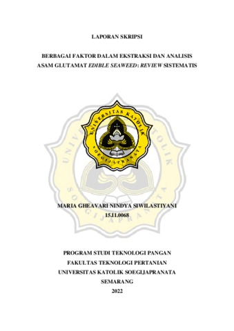SIWILASTIYANI, MARIA GHEAVARI NINDYA (2022) BERBAGAI FAKTOR DALAM EKSTRAKSI DAN ANALISIS ASAM GLUTAMAT EDIBLE SEAWEED: REVIEW SISTEMATIS. S1 thesis, Unika Soegijapranata Semarang.