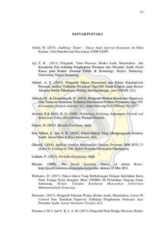 Tujuan dari penelitian ini adalah sebagai berikut untuk mengetahui pengaruh positif time budget pressure terhadap Premature Sign Off. Untuk mengetahui pengaruh negatif Locus Of Control Internal terhadap Premature Sign Off. Untuk mengetahui pengaruh negatif kesadaran etis terhadap Premature Sign Off. Untuk mengetahui pengaruh negatif komitmen organisasi terhadap Premature Sign Off. Untuk mengetahui pengaruh negatif supervisi terhadap Premature Sign Off. Untuk mengetahui pengaruh positif materialitas berpengaruh terhadap Premature Sign Off. Populasi dalam penelitian ini adalah seluruh auditor yang bekerja pada KAP di Semarang. Teknik pengambilan sampel dalam penelitian ini diperoleh dari populasi penelitian dengan menggunakan metode purposive sampling. Kesimpulan pada penelitian ini adalah time budget pressure tidak berpengaruh terhadap Premature Sign Off. Locus Of Control Internal tidak berpengaruh terhadap Premature Sign Off. Kesadaran Etis berpengaruh negatif terhadap Premature Sign Off. Komitmen Organisasi tidak berpengaruh negatif terhadap Premature Sign Off. Supervisi tidak berpengaruh negatif terhadap Premature Sign Off. Materialitas berpengaruh tidak positif terhadap Premature Sign Off.