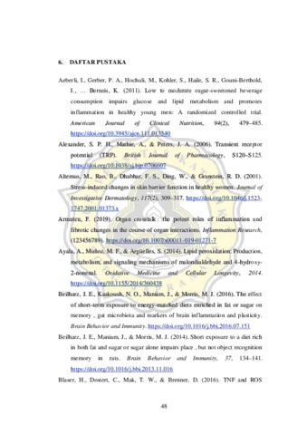Kondisi stres sangat mudah dialami oleh setiap orang tanpa memandang usia dan gender. Stress terjadi akibat aktifnya stressor karena kejadian negatif, ketegangan kronis, serta trauma yang berdampak merusak kesehatan fisik dan mental. Stres fisik dan stres mental akan mengakumulasi terjadinya stres oksidatif berupa peningkatan hormon stres kortisol pada manusia, hormon stres corticosteroid pada hewan pengerat (tikus, mencit) dan ROS (reactive oxygen species). Kondisi stres berikut akan mendorong keinginan makan enak untuk memenuhi reward sistem pada otak dengan cara mengonsumsi makanan tinggi lemak dan atau tinggi gula. Stres akan mengaktifkan sumbu HPA (Hypothalamic Pituitary Adrenal) melalui corticotropin-releasing hormone (CRH) kemudian melepaskan glukokortikoid (GCs) dari adrenal dan menekan respon imun sehingga meningkatkan potensi kenaikan pro-inflammatory cytokines lebih lanjut. Inflamasi merupakan peradangan yang disebabkan oleh rusaknya suatu jaringan tubuh. Sistem imun berperan sebagai pencegah terjadinya inflamasi lebih lanjut dengan mengandalkan sel-sel imun. Gula merupakan salah satu bahan tambah pangan yang memiliki kandungan tinggi kalori tanpa nutrisi lainnya. Asupan gula melebihi rekomendasi dapat berpotensi besar menyebabkan ketidakseimbangan nutrisi dalam tubuh. Gula dan stress secara bersamaan dan dalam jangka waktu lama akan meningkatkan Inflamasi yang merangsang Sistem imun secara signifikan. Tujuan penelitian ini yaitu untuk mengetahui efek dari intervensi gula dan stress terhadap inflamasi dan sistem imun serta mediator inflamasi crosstalk. Asupan sesuai rekomendasi atau kurang dapat menurunkan kadar stres berupa ROS juga meningkatkan sistem imun dan mencegah terjadinya inflamasi. Asupan gula berlebih dapat berupa gula tambahan yang banyak terkandung dalam makanan dan minuman kemasan. Penggunaan gula fruktosa merupakan jenis monosakarida yang berpengaruh terhadap kesehatan tubuh. Jurnal yang banyak beredar merupakan jenis animal study, karenanya diperlukan penelitian secara klinis. Jurnal lain yang banyak beredar merupakan kombinasi dari efek konsumsi gula dan lemak secara bersamaan. Oleh karena itu dibutuhkan penelitian secara klinis tentang pemberian gula tambahan berlebih secara individu sehingga dapat diperoleh hasil yang tepat tentang intervensi gula tambahan dan efeknya terhadap oxidative stress, sistem imun dan inflamasi.