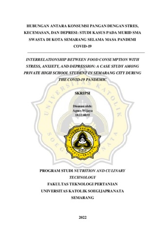 WIJAYA, AGNES (2022) HUBUNGAN ANTARA KONSUMSI PANGAN DENGAN STRES, KECEMASAN, DAN DEPRESI: STUDI KASUS PADA MURID SMA SWASTA DI KOTA SEMARANG SELAMA MASA PANDEMI COVID-19. INTERRELATIONSHIP BETWEEN FOOD CONSUMPTION WITH STRESS, ANXIETY, AND DEPRESSION: A CASE STUDY AMONG PRIVATE HIGH SCHOOL STUDENT IN SEMARANG CITY DURING THE COVID-19 PANDEMIC. S1 thesis, Unika Soegijapranata Semarang.