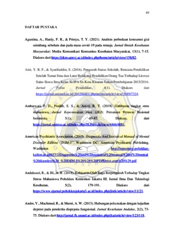 Selama pandemi COVID-19, kesehatan mental masyarakat semakin menurun, terutama pada remaja. WHO (2021) mencatat bahwa kematian usia remaja dengan bunuh diri di usia 15-29 tahun salah satu faktornya disebabkan depresi. Depresi dapat terjadi akibat tekanan yang berat sehingga mengalami stres yang berkelanjutan. Penderita depresi juga biasanya berkaitan dengan adanya gangguan kecemasan. Perubahan proses pembelajaran akibat pandemi COVID-19 membuat banyak pelajar mengalami proses adaptasi yang tidak mudah sehingga memberi tekanan yang berujung rentan mengalami gangguan kesehatan mental. Usia remaja juga cenderung kurang peduli terhadap jenis makan yang diasup sehingga berisiko terserang banyak radikal bebas, menurunkan imunitas, meningkatkan risiko mengalami gangguan kesehatan mental. Maka penelitian ini dilakukan untuk memahami bagaimana kondisi kesehatan mental individu serta hubungannya dengan konsumsi pangan. Metode yang digunakan pada penelitian ini adalah pendekatan kuantitatif melalui FFQ (Food Frequency Questionaire) dan DASS- 21 (Depression Anxiety and Stress Scale-21). Hasil penelitian menunjukkan bahwa adanya hubungan antara demografi, daily consumption, serta nutrition score dengan kesehatan mental. Gender berkorelasi terhadap stres dan kecemasan (p-value: 0,002;0,001). Kacang berkorelasi terhadap stres dan kecemasan (p-value: 0,005;0,030). Sayur dan buah berkorelasi terhadap stress (p-value: 0,001). Minuman herbal berkorelasi dengan depresi (p-value: 0,035). Makanan manis berkorelasi dengan kecemasan (p-value: 0,035). Nutrition score berkorelasi terhadap stres (p-value: 0,007). Kacang secara berbanding terbalik berpengaruh terhadap stres (OR: 0,42; p-value: 0,043). Sayur dan buah secara berbanding terbalik berpengaruh terhadap stress (OR: 0,34; p-value: 0,02). Makanan manis secara berbanding lurus berpengaruh terhadap kecemasan (OR: 2,49; pvalue: 0,033). Stres secara berbanding terbalik berpengaruh terhadap perilaku mengonsumsi sayur dan buah (OR: 0,17; p-value: 0,003). Kecemasan secara berbanding lurus berpengaruh terhadap perilaku mengonsumsi makanan manis (OR: 2,44; p-value: 0,043). Nutrition score berkorelasi terhadap stres (p-value: 0,007). Nutrition score memberi pengaruh terhadap stres (p-value Q2-Q4: 0,012;0,008;0,039 dengan OR: 2,21;2,25;1,88). Dari penelitian ini dapat disimpulkan bahwa beberapa jenis konsumsi pangan berpotensi memiliki asosiasi dengan kesehatan mental.