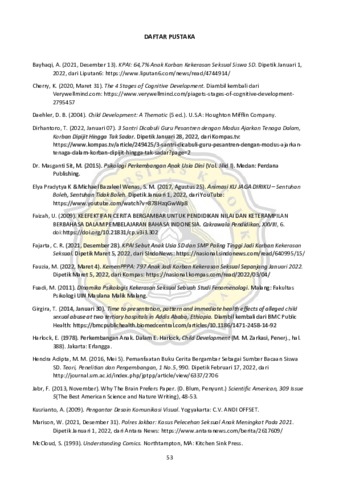 Dalam dua tahun terakhir sejak dunia tengah dilanda pandemi COVID-19, tingkat kejahatan seksual di Indonesia seketika meningkat dengan drastis. Tidak hanya dialami oleh orang dewasa, tetapi yang lebih parahnya juga dialami oleh anak-anak. Maka dari itu sebagai orangtua, sudah seharusnya kita melindungi anak mereka dengan memberikan edukasi dan melatih mereka untuk mengenal kesehatan seksual dan menghindari segala macam bentuk interaksi yang dapat mengarah ke terjadinya kekerasan maupun pelecehan seksual. Dengan dirancangnya buku ‘Belajar Dari Tika dan Tio’ diharapkan dapat mempermudah orangtua maupun tenaga pendidik di Indonesia khususnya di Kota Semarang dan sekitarnya dalam mengajarkan edukasi mengenai bentuk-bentuk interaksi berupa sentuhan boleh dan tidak boleh yang harus dihindari anak, dengan bahasa yang mudah dipahami anak didukung dengan ilustrasi yang menarik terntunya. Kata kunci : cergam, anak, kejahatan seksual, ilustrasi
