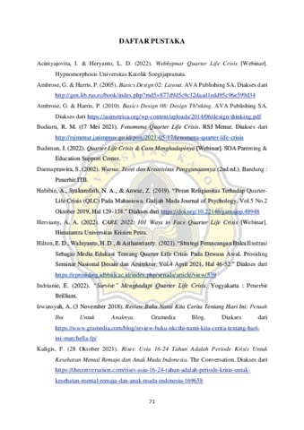 Kesehatan mental merupakan sebuah topik yang perlu diketahui oleh masyarakat. Data yang diperoleh menunjukkan bahwa usia remaja merupakan masa-masa krisis bagi individu karena rentan mengalami gangguan kesehatan mental. Perkembangan pada usia remaja menuju dewasa menimbulkan terjadinya fase Quarter Life Crisis yang dipengaruhi oleh faktor internal maupun eksternal. Quarter Life Crisis adalah krisis emosional yang dapat menyebabkan timbulnya stress dan gangguan kesehatan mental. Oleh karena itu, perancangan buku cerita ilustrasi mengenai Quarter Life Crisis dibuat untuk memberikan informasi kepada remaja tentang bagaimana cara meningkatkan resiliensi pada situasi yang sulit tersebut. Kata kunci: Kesehatan Mental, Quarter Life Crisis, Buku Cerita Ilustrasi, Komunikasi Visual