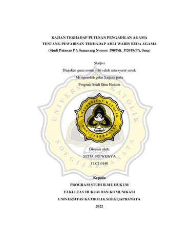 WIJAYA, SETIA SRI (2022) KAJIAN TERHADAP PUTUSAN PENGADILAN AGAMA TENTANG PEWARISAN TERHADAP AHLI WARIS BEDA AGAMA (Studi Putusan PA Semarang Nomor: 190/Pdt. P/2019/PA. Smg). S1 thesis, Universitas Katholik Soegijapranata Semarang.