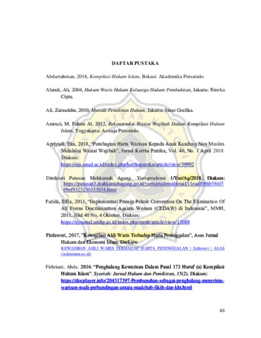 Skripsi ini dengan judul “Kajian Terhadap Pengadilan Agama Tentang Pewarisan Terhadap Ahli Waris Beda Agama (Studi Putusan PA Semarang Nomor 190/Pdt.P/2019/PA Smg)” dilatarbelakangi pandangan hukum Islam yang mengatur bahwa salah satu penyebab terputusnya hak waris seseorang salah satunya adalah perbedaan agama. Rumusan permasalahan dalam penelitian ini adalah: 1) Bagaimana putusan Nomor 190/Pdt.P/2019/PA.Smg terhadap permohonan pembagian harta warisan terhadap ahli waris beda agama. 2) Bagaimana pelaksanaan pembagian harta warisan telah memberikan rasa keadilan kepada ahli waris putusan Nomor 190/Pdt.P/2019/PA.Smg. Metode yang digunakan dalam penelitian ini adalah metode kualitatif. dalam penelitian ini digunakan untuk membahas mengenai ketentuan perundang-undangan yang berlaku dikaitkan dengan teori hukum serta melihat kenyataan permasalahan yang terjadi. Dalam penelitian ini data primer diperoleh melalui wawancara dengan dosen UIN Walisongo dan data sekunder diperoleh melalui studi kepustakaan yang meliputi: Putusan Pengadilan Agama Tentang Pelaksanaan Pewarisan Terhadap Ahli Waris Beda Agama dalam Perkara Nomor 190/Pdt.P/2019/PA.smg, dan bahan-bahan hokum lainnya. Hasil penelitian menunjukkan bahwa: 1) Putusan Pengadilan Agama Nomor 190/Pdt.P/2019/PA.Smg. Memutuskan bahwa seorang ahli waris yang berbeda agama tidak berhak mendapatkan harta warisan. Putusan dibuat berdasarkan pertimbangan dan putusan hakim dalam putusan bahwa anak pewaris telah berpindah agama dan sekarang beragama katholik. (2) Keadilan yang diperoleh ahli waris dalam kasus ini dikategorikan sebagai keadilan distributif karena pewarisan hanya didasarkan pada peraturan perundang-undangan, yaitu Pasal 171 Huruf C Kompilasi Hukum Islam. Akan tetapi dalam praktek, ahli waris non Muslim tetap mendapatkan bagian harta warisan dari pewaris Muslim sama dengan ahli waris muslim lainnya melalui hibah semasa pewaris masih hidup.