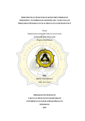 TANUWIJAYA, IRENE (2022) PERLINDUNGAN HUKUM BAGI KONSUMEN TERHADAP TERJADINYA WANPRESTASI OLEH PELAKU USAHA DALAM PERJANJIAN PENGIKATAN JUAL BELI SATUAN RUMAH SUSUN. S1 thesis, Universitas Katholik Soegijapranata Semarang.