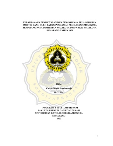 LUMBANRAJA, CALVIN STEVEN (2022) PELAKSANAAN PENGAWASAN DAN PENANGANAN PELANGGARAN POLITIK UANG OLEH BADAN PENGAWAS PEMILIHAN UMUM KOTA SEMARANG PADA PEMILIHAN WALIKOTA DAN WAKIL WALIKOTA SEMARANG TAHUN 2020. S1 thesis, Universitas Katholik Soegijapranata Semarang.
