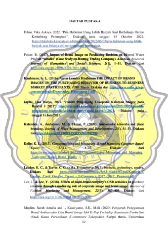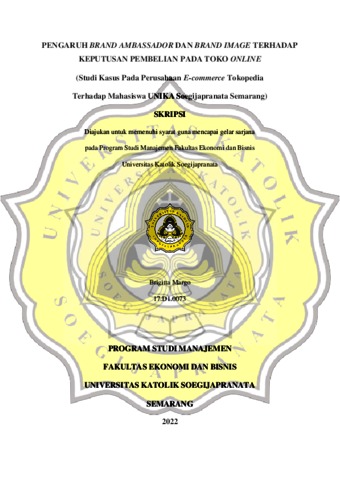 Margo, Brigitta (2022) PENGARUH BRAND AMBASSADOR DAN BRAND IMAGE TERHADAP KEPUTUSAN PEMBELIAN PADA TOKO ONLINE (Studi Kasus Pada Perusahaan E-commerce Tokopedia Terhadap Mahasiswa UNIKA Soegijapranata Semarang). Other thesis, Universitas Katholik Soegijapranata Semarang.