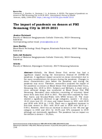 CHRISTANTI, JESSICA and Adisusianto, Indra (2022) The impact of pandemic on donors at PMI Semarang City in 2019-2021. International Journal. of Health Sciences,, 16 (6). pp. 2348-2355. ISSN 2550-6978