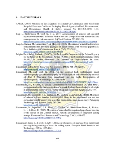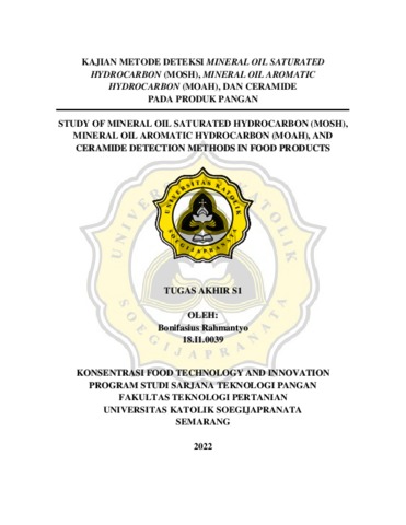RAHMANTYO, BONIFASIUS (2022) KAJIAN METODE DETEKSI MINERAL OIL SATURATED HYDROCARBON (MOSH), MINERAL OIL AROMATIC HYDROCARBON (MOAH), DAN CERAMIDE PADA PRODUK PANGAN STUDY OF MINERAL OIL SATURATED HYDROCARBON (MOSH), MINERAL OIL AROMATIC HYDROCARBON (MOAH), AND CERAMIDE DETECTION METHODS IN FOOD PRODUCTS. S1 thesis, Universitas Katolik Soegijapranata Semarang.