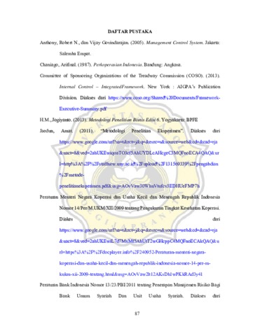 Penelitian ini memiliki tujuan diantaranya bagi KSP Sarana Bhakti Cabang Utama Bulu Semarang dapat memiliki Sistem Pengendalian Manajemen yang meliputi lingkungan pengendalian, penilaian risiko, prosedur pengendalian, pemantauan, informasi dan komunikasi untuk mengendalikan pelaksanaan kegiatan simpan pinjam secara strategis dan operasional. Dan bagi Dinas Koperasi dapat menjadi perhatian tentang aspek pengendalian Dinas terhadap Koperasi. Jenis penelitian dengan métode Applied Research dimana riset yang ada dipecahkan dengan suatu teori dan dikembangkan untuk menghasilkan suatu produk. Informan yang dipilih oleh peneliti merupakan Kepala Cabang, Pengawas, serta PDL KSP Sarana Bhakti Cabang Utama Bulu Semarang yang memiliki tugas dan tanggung jawab yang berkaitan dengan kredit anggota. Penyelesaian problem dengan menggunakan lima komponen SPM yaitu Lingkungan Pengendalian, Penilaian Risiko, Prosedur Pengendalian, Informasi dan Komunikasi, serta Pemantauan. Hasil penelitian yaitu pada lingkungan pengendalian KSP Sarana Bhakti Cabang Utama Bulu Semarang belum terdapat reward/penghargaan dan sanksi/punishment , pada penilaian risiko KSP Sarana Bhakti Cabang Utama Bulu Semarang mengelola risiko yang ada dengan melakukan pengukuran risiko, pada prosedur pengendalian KSP Sarana Bhakti Cabang Utama Bulu Semarang telah memiliki SOP namun tidak berjalan dengan baik, pada informasi dan komunikasi penentuan nilai dalam melakukan taksasi jaminan menggunakan nilai dari dealer motor atau mobil dan OLX, pada pemantauan pengembangan yang dilakukan belum dilakukan evaluasi.