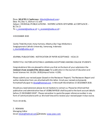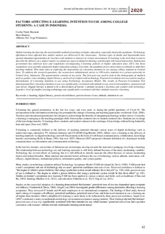MURNIATI, CECILIA TITIEK and HARTONO, HENY and Widiantoro, Albertus Dwiyoga (2020) FACTORS AFFECTING E-LEARNING INTENTION TO USE AMONG COLLEGE STUDENTS: A CASE IN INDONESIA. JOURNAL OF EDUCATION AND SOCIAL SCIENCES, VOL. 16, OCTOBER 2020, 16 (1). pp. 42-48. ISSN 2289-1552