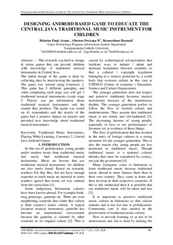 helarius panji, panji and Widiantoro, Albertus Dwiyoga and Harnadi, Bernardinus (2020) DESIGNING ANDROID BASED GAME TO EDUCATE THE CENTRAL JAVA TRADITIONAL MUSIC INSTRUMENT FOR CHILDREN. SISFORMA, 7 (2). pp. 90-97. ISSN 2355-8253
