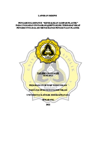 HANNALEE, TAN ERIN (2022) PENGARUH KAMPANYE “KENDALIKAN SAMPAH PLASTIK” PADA UNGGAHAN INSTAGRAM @DIPTS.KLHK TERHADAP SIKAP PENGIKUTNYA DALAM MENGURANGI PENGGUNAAN PLASTIK. S1 thesis, Unika Soegijapranata Semarang.