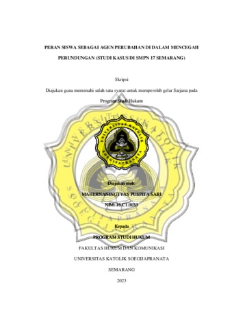 SARI, MAHERNANINGTYAS PUSPITA (2023) PERAN SISWA SEBAGAI AGEN PERUBAHAN DI DALAM MENCEGAH PERUNDUNGAN (STUDI KASUS DI SMPN 17 SEMARANG). Other thesis, Universitas Katholik Soegijapranata Semarang.