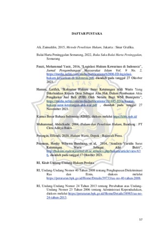 ARDIANTI, ELISABETH OKTIVIANI KUMALA (2023) PELAKSANAAN PENGURUSAN SURAT KETERANGAN WARIS TERHADAP TIGA GOLONGAN PENDUDUK DI INDONESIA SETELAH BERLAKUNYA PMA NOMOR 16 TAHUN 2021 TENTANG PERUBAHAN KETIGA ATAS PERATURAN MENTERI NEGARA AGRARIA/KEPALA BADAN PERTANAHAN NASIONAL NOMOR 3 TAHUN 1997 TENTANG KETENTUAN PELAKSANAAN PERATURAN PEMERINTAH NOMOR 24 TAHUN 1997 TENTANG PENDAFTARAN TANAH (STUDI DI KOTA SEMARANG). Other thesis, Universitas Katholik Soegijapranata Semarang.