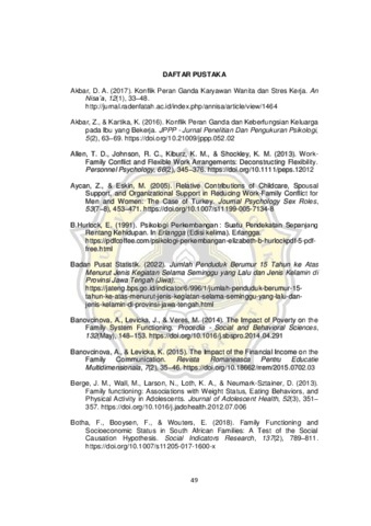 Penelitian ini bertujuan untuk mengetahui hubungan antara konflik peran ganda pada istri yang bekerja dengan keberfungsian keluarga di PT. X Semarang. Hipotesis yang diajukan peneliti terdapat hubungan negatif antara konflik peran ganda pada istri yang bekerja dengan keberfungsian keluarga. Subjek dalam penelitian ini adalah istri yang bekerja, berusia 18-40 tahun, memiliki minimal satu anak, istri-anak-suami tinggal bersama. Jumlah subjek yang terlibat dalam penelitian ini sebanyak 40 orang istri yang bekerja. Teknik pengambilan sampel menggunakan incidental sampling. Jenis penelitian menggunakan penelitian kuantitatif korelasional. Alat ukur yang digunakan adalah skala keberfungsian keluarga berdasarkan McMaster Family Functioning Model Theory (MMFF) dan skala konflik peran ganda berdasarkan Work Family Conflict Scale (WFCS). Metode analisis data yang digunakan adalah teknik korelasi Product Moment dari Karl Pearson. Berdasarkan hasil perhitungan didapatkan hasil nilai koefisiensi korelasi (rxy) = -0.257 dengan p=0.055 > 0.05. Dengan demikian hipotesis ditolak, sehingga dapat disimpulkan bahwa tidak ada hubungan antara konflik peran ganda pada istri yang bekerja dengan keberfungsian keluarga. Sumbangan efektif konflik peran ganda terhadap keberfungsian keluarga sebesar 6.6%. Semakin rendah tingkat konflik peran ganda, maka semakin tinggi tingkat keberfungsian keluarga pada istri yang bekerja